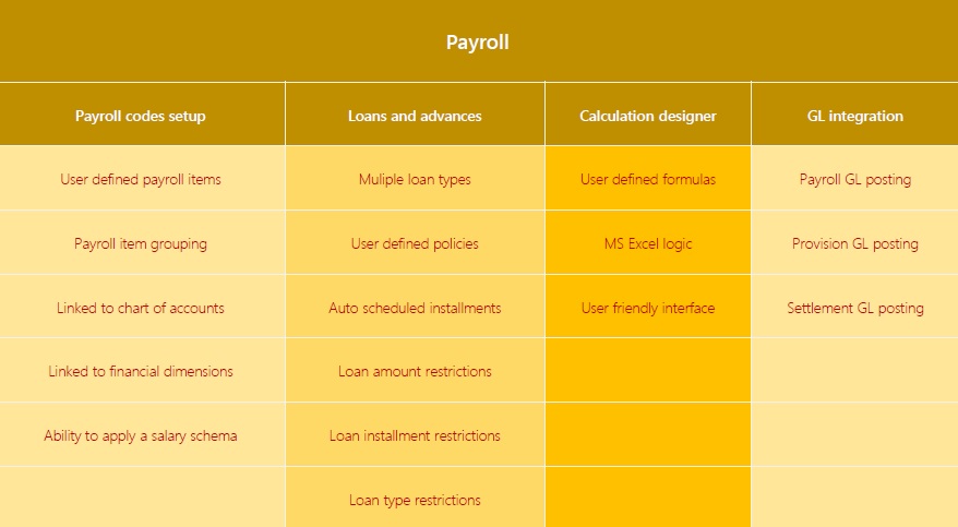 As part of a fully integrated business management solution, People First Payroll for Microsoft Dynamics AX can help businesses streamline their processes, reduce costs, gain insight into personnel costs, and improve payroll accuracy—even when dealing with exceptions and complex workforce challenges. Payroll can manage everything from time entry to posting to GL, including complex calculations for earnings, benefits, deductions and pensions. The solution offers effective-date capabilities, and handles income tax obligations. It support Eligibility Matrix configuration with (minimum – midpoint – maximum) values. With flexible user-defined rules, businesses can adapt corporate processes to changing workforce needs and demanding requirements. Designed to help connect information and processes across the enterprise, People First Payroll for Microsoft Dynamics AX delivers business-wide visibility into employee status and history. An integral component of Microsoft Dynamics AX, Payroll works with an intuitive, empowering employees with a solution that’s easy to learn and use and reducing the need to juggle separate applications. It also integrates tightly with the Microsoft Dynamics AX database structure and operates smoothly with Microsoft Dynamics AX Human Resources and general ledger functionality as well as Microsoft SQL Server Reporting Services.